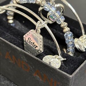 Alex and Ani Silver Bracelet Adjustable Blue Crystals Sister & Heart Charms