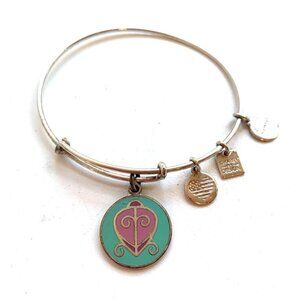 One Alex and Ani charm bracelet with one large green & pink charm and three smaller silver charms. Expands from 2.0”- 3.5” to fit most wrists.