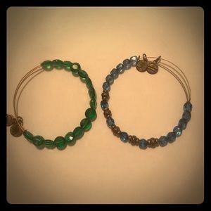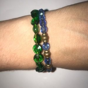 Emerald green beaded bracelet and blue and bronze bracelet for sale. Stack them up. $12 for each or $20 for both. Retail price $56. Stack these up your arm, adjustable and go with everything.