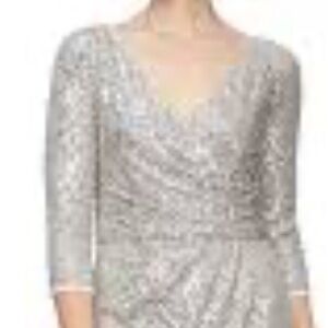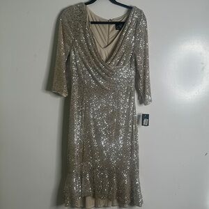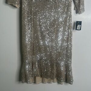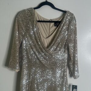 Alex evening's sequins midi dress size 8 armpit to armpit is 17 inches shoulder to hem is 42 inches the waist 15 inches has asmll flaws please see last picture color champagne