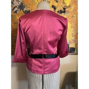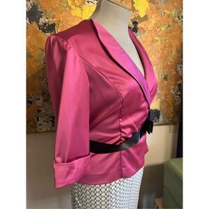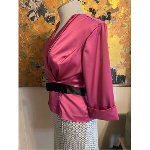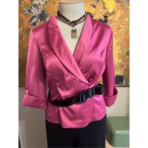From Alex evenings comes this gorgeous pink satin top for any dressy occasion! This zips up the back and would look amazing with black pants or a black long long skirt! This has a ribbon belt with a sparkly black rhinestone buckle. Beautiful condition! The belt does hang a little it could be tacked up if that bothers you. Poly spandex to dry clean only.