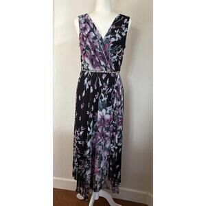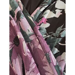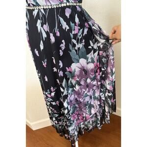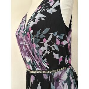 The Alexa B Nites Evening Maxi Dress in Size 10 is a Y2K style dress made of semi-sheer fabric with a double layer floral pattern. This maxi dress features a V-neckline, sleeveless design, and a front waist adorned rhinestones on the waist, elasticized waist on the back. With a mix of black, pink, purple, lilac colors and a little bit of green.