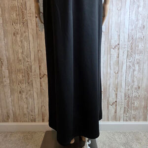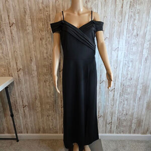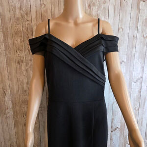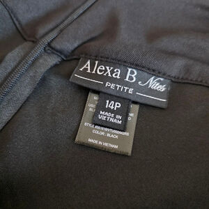 This is an Alexa B Nites Petite black dress, size 14P, in new condition with tags. The dress features thin straps and an off-the-shoulder design with pleated detailing across the chest. It has a concealed back zipper closure. The material appears to be a smooth, matte fabric. The dress has a slit on the side. No visible imperfections are noted.