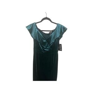 Elevate your evening look with this stunning hunter green velvet maxi dress by Alexa B nites. The off-shoulder neckline and surplice design add a sophisticated touch to this shift/sheath style dress. Perfect for any occasion, this dress is available in size 8 and features a long hemline for an elegant look. The rich green hue is sure to turn heads, making this dress a must-have for any fashion-forward wardrobe.