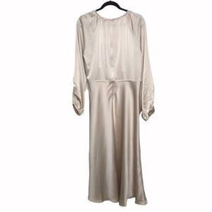 Champagne beige satin, long sleeve dress with gathered / tie empire waist, square neck with tie, and gathered sleeve detail. Very flowy, silky, and elegant and has a vintage night gown appeal. As seen on Alexa Chung. Preowned but in great condition.