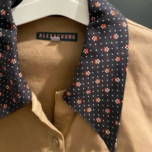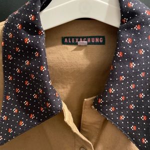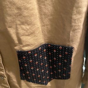 Tan denim shirtdress with long sleeves. Button up front with printed floral and polka dot collar and pocket. No odors, no signs of wear. Only worn once. Size 10 fits US M.