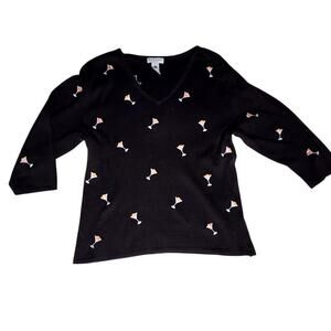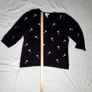 Alexander Bartlett, 1X, embroidered top, tequila sunrise, tropical drink, cocktail shirt, black cotton, 3/4 sleeve, resort wear, cruise fashion, summer top, vacation vibes, novelty embroidery, boho, beachy, retro style, made in Singapore, relaxed fit, plus size