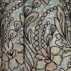 Stunning fully sequined column gown with a floral embroidered overlay. Heavily beaded embellished neckline and waist.