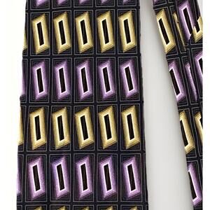 With its striking navy, purple, and green geometric pattern, this tie adds a touch of designer flair to your outfit. The tie is vintage yet maintains a modern edge, making it perfect for a range of occasions. Crafted in China, this piece exemplifies the blend of classic style and contemporary design.