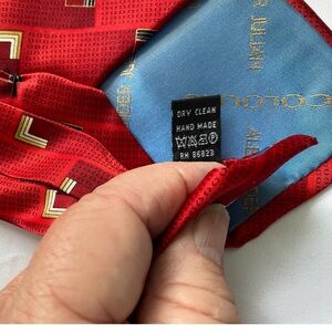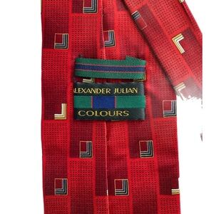 Alexander Julian was a clothing designer known for his colorful and patterned designs. Based on the style of this tie and the RN, this tie is likely from the late 1980s or early 1990s, when Alexander Julian's "Colours" line was popular. These ties are usually made of satin and polyester. The tag, although, states that it is 100% silk, giving it increased value. Vintage ties, especially those from well-known designers like Alexander Julian, are often sought after by collectors and fashion enthusiasts. Red ties are also considered "power ties" and are associated with authority and strength.