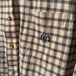 Casual button-down shirt with a classic plaid pattern. Features blue and cream colors. Ideal for everyday wear.