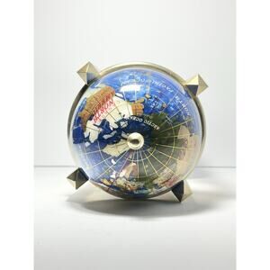 Good vintage condition. No damage to globe, brass, or timepieces. Timepieces work and pop out and back in easily. Rotates effortlessly. Brass has slight hazing tarnish and will need polishing. Timepieces do not come with batteries. Requires 377/376 battery type.