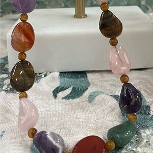 Featured in this necklace is Carnelian, Amethyst, Smoky Quartz, Rose Quartz, Aventurine, and Tiger’s Eye. Together they are believed to provide: