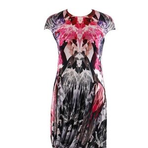 Alexander McQueen 2008 sheer silk blouse with bow tie at neck in an abstract blue and violet pattern. From his SS2007 Collection "La Dame Bleue. Bust 34", waist 31", length 25"