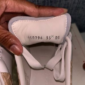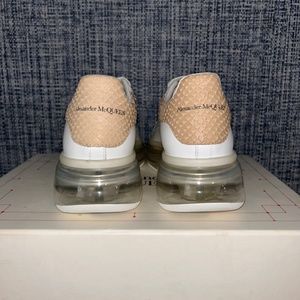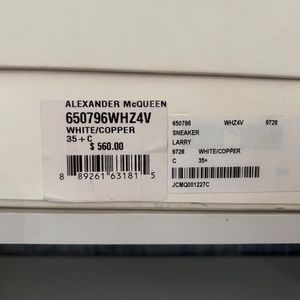 NWOT Authentic Alexander McQueen sneakers, size 35.5, in white/copper (khaki/beige) w/ snakeskin print. Worn once. Comes with an extra pair of white laces.