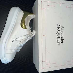 Alexander McQueen Larry White/Gold Croc-Embossed Sneakers, size 42 (US Men's 9). These luxurious sneakers feature a clean white leather upper with striking gold croc-embossed heel tabs, showcasing the iconic Alexander McQueen branding. The oversized rubber sole provides a distinctive look and comfortable lift. Made from premium leather, these sneakers are perfect for adding a touch of high-fashion streetwear to any outfit. Excellent pre-owned condition with minimal signs of wear on the soles and uppers. Original box included.