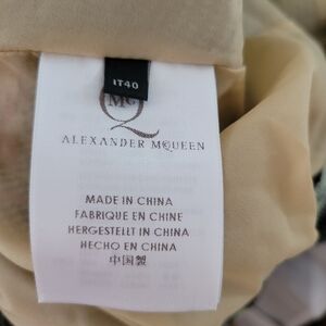 Alexander McQueen McQ bodycon dress with rainbow of multicolor abstract paint splotch print with low scooped neckline and front draping material. Measurements below of garment laying flat, unstretched (material is stretchy): Size 40, approximately US Size 4 or Small, please refer to measurements for best fit, but note that material is stretchy and meant to be body snugging Chest 16" Waist 13" Length 38" Hips 16" Tags: designer, luxury, modern, abstract, contemporary, runway, celeb style, bodycon, sexy