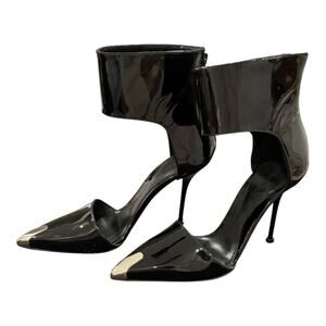 Command attention with these striking Alexander McQueen ankle cuff pumps—where high fashion meets rebellious edge. Crafted from glossy black patent leather, these stiletto heels feature a bold metal-capped pointed toe and wide leather ankle strap with a statement buckle, channeling McQueen’s signature punk-rock aesthetic.