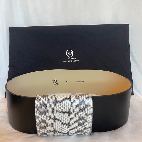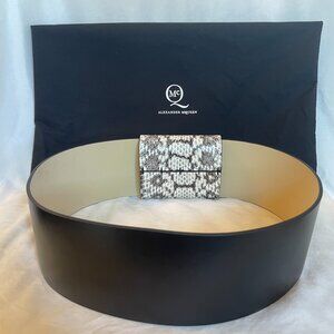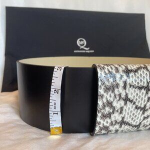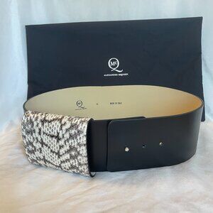 This beautiful and unique Alexander McQueen wide leather waist belt is accented with black and white snake skin. Size medium and made in Italy. Minor wear.