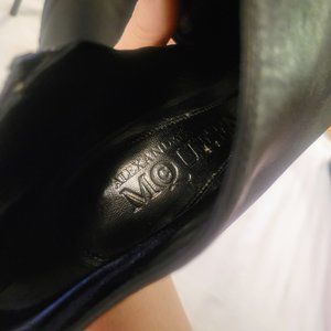 Alexander McQueen Black Leather Ankle Stiletto Booties Platform Peep Toe Heels - In gently worn condition. Zipper closure. Light scuffing on heel & toes. Slightly worn heel tips. Sz 37.5 Please see photos for details & measurements.