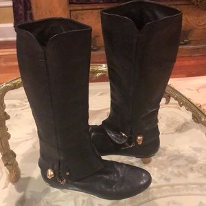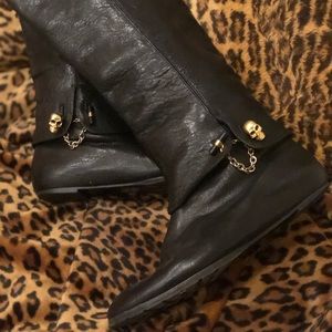 Elegant black leather boots. Features gold skull accents. Over the knee design. This is a RePosh I LOVE them but they do not fit me. The feet part is true to size fitted. NO DAMAGE IN AMAZING CONDITION 😊