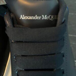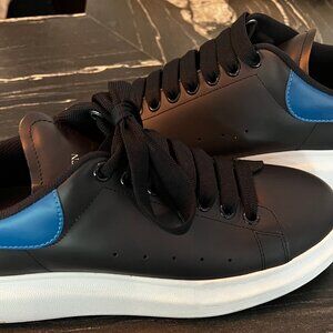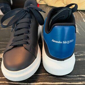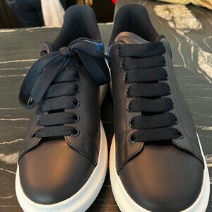 Black leather with blue leather accent on these sneakers perfect for casual or dressing up. The back of the sneaker features the Alexander McQueen logo. These sneakers have been worn once!! MINT Condition! The sneakers are size 10.5 US.