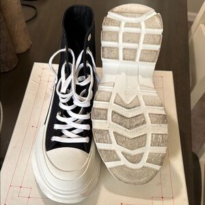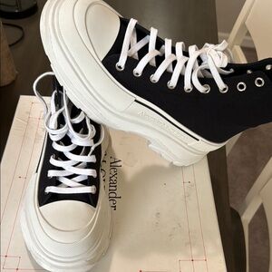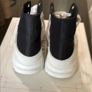 Chic high-top sneakers with a bold black and white contrast. Features durable white laces and a sturdy sole.