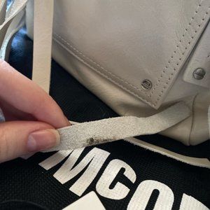 Completely sold out Alexander McQueen cream colored mini convertible box bag with extra tassels and original tag. Can be worn like a backpack or a shoulder bag and opens from both sides. Small stain on one of the tassels that might be able to be rubbed off or can be replaced with included extra tassels as well as some discoloration on the bottom that might be rubbed off. Only used twice so besides that, it’s in really good condition!