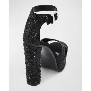 Heeled sandals made in Italy featuring an open round toe, buckled ankle strap, crystal-embellished upper and outsole, 5.31” heel with 1.77” platform for a 3.54” heel feel, fabric upper, and leather lining and sole.