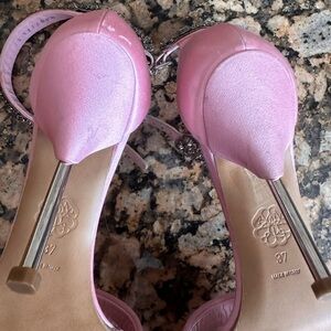 A dazzling array of crystals illuminates the ankle strap of a petal-pink satin sandal given a touch of punky edge with a gleaming pin heel.