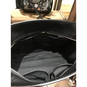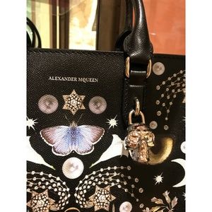 Reposhing this item. Loved it, but ready to rotate for something new. GORGEOUS bag from Alexander McQueen in the RARE unicorn, butterfly and more. They form a black cat print. This bag is practically perfect, no signs of wear. textured black leather with design in pearl, blush, pale blue, and pale yellow. Bag is approximately 11 3/4" wide x 9" tall x 6.5" deep. Double handle with additional shoulder strap. Silver skull has lock & key to remove if needed. Double zipper top and 3 interior pockets. In perfect condition. Previous photos and new photos are loaded!