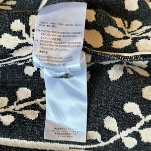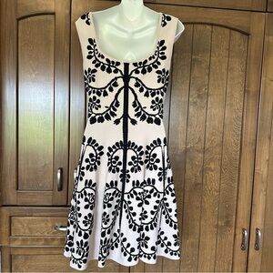Alexander McQueen Intarsia Stretch-knit Dress in ivory and black. The dress features a jacquard pattern resembling a tree and floral designs. It has a round neckline and a sleeveless design. The dress is fitted at the top and flares out into a skater-style skirt. Stretchy and comfortable, yet beautiful and high fashion.