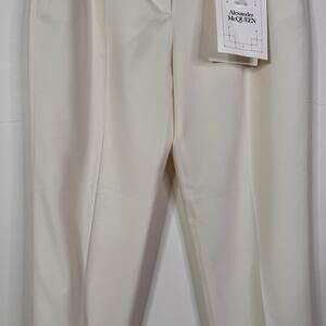 A timeless tailored piece from Alexander McQueen, these ivory wool trousers offer impeccable structure with a high waist, pleated front, and slim tapered leg. Crafted in Italy from 100% virgin wool with a luxe cupro lining, they strike the perfect balance of sharp tailoring and modern elegance. Finished with belt loops, side pockets, and a back welt pocket. New with tags, retailing at premium designer price point.
