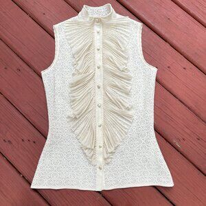 Gorgeous Authentic Alexander McQueen Made in Italy Lace Ruffled Detail Sleeveless knit stretch lace button up blouse. Siz L, run small. It's rexudes romantic elegance with intricate lace accents and delicate ruffles for a feminine, textured look. Its sleeveless design and soft fstretchy abric make it perfect for layering or wearing on its own. Pair it with high-waisted trousers and pointed heels for a sophisticated outfit ideal for both office and evening occasions. Condition: Very good couple of pulls-on jabot -invisuble, ast pic. Lighg cream.