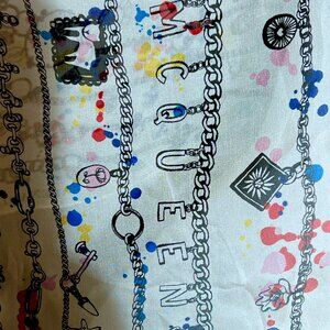 Authentic Alexander McQueen silk chiffon scarf. Extra large square size at 53 inches by 53 inches. Base color is cream, with black charm bracelet motif, and plenty of McQueen skulls. Accent paint splatter in red, blue and yellow. Alexander McQueen spelled out in charms throughout, with logo tag on side, as well as printed logo/name on corner of scarf. 100% silk. Probably worn a few times, but no wear and tear.