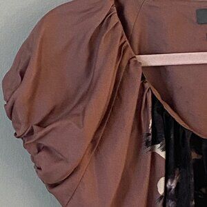 Ruched Scoop neckline. Lined bust. Pullover style with puffed sleeves.