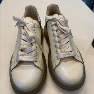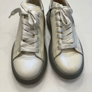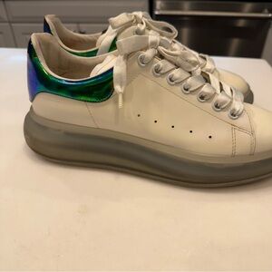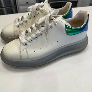Very good condition. Men’s Alexander McQueen white leather sneakers with green iridescent accents. Lace up, Rubber translucent bottoms. ***some yellowing, otherwise great condition. see photos. Size US 9 EU 42. MSRP $840