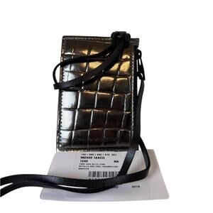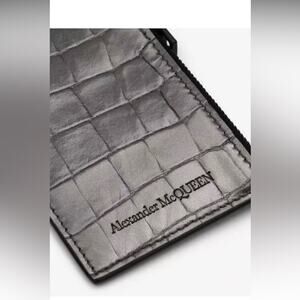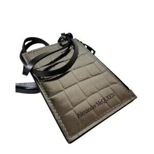 This Alexander McQueen crossbody bag showcases modern sophistication with its black and silver croc-embossed design, crafted from premium nappa and calfskin leather. The front is detailed with the Alexander McQueen nameplate, paired with silver-tone hardware for a polished finish. Compact yet practical, it features a smooth leather interior with card slots, perfect for carrying daily essentials. The versatile adjustable strap allows it to be worn crossbody or doubled as a shoulder bag.