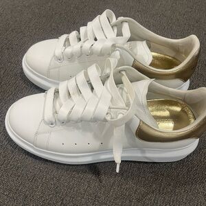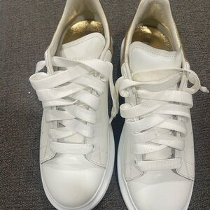 Step out in style with these chic white and gold men’s Alexander McQueen sneakers. Perfect for any casual outing, these shoes offer both comfort and elegance.