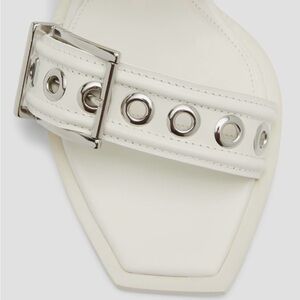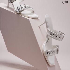 Chic white sandals with sleek stiletto heel. Stylish buckle detail. Perfect for elegant outings.