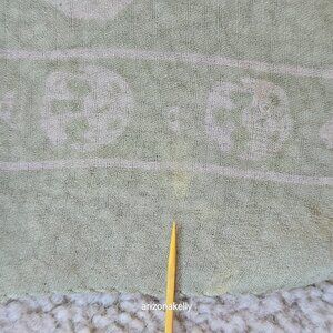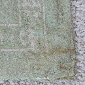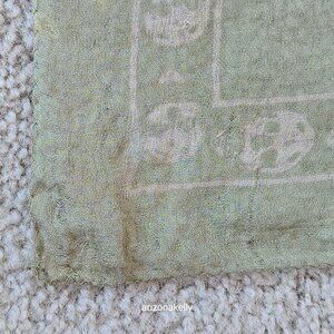 This scarf is in very good used condition. There is some faint discoloration throughout, which at first I thought was stains. In looking at other ones online, it looks like the mottled design is intentional. It's very subtle--I had a hard time getting it to show up. The scarf is showing a little wear, primarily in the form of fraying/threadbare on two of the corners, which I treated with an invisible fray block product. No holes or runs. There are three faded spots, pictured with a toothpick for scale.