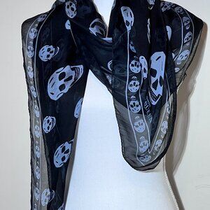 Alexander McQueen Skull scarf/shawl, with all over skull print. Silk is black and white, however, the logo is light blue (photos read a bit blue). Made in Italy. Never worn. Approx. 41 inches by 47 inches. Fabric tag removed, logo tag remains.