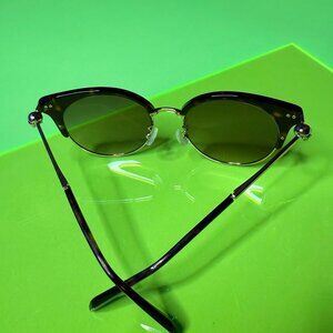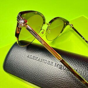 DETAILS: Featuring a tortoise shell round frame with subtle cat-eye lift, gold-tone hardware, and McQueen’s iconic skull detail at the temples. Includes original case and soft pouch.