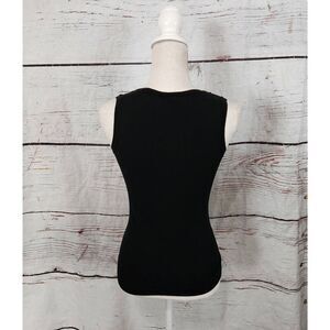 Black wool sleeveless scoop neck knit top is a wardrobe staple. Featuring a soft knitted wool in a sleeveless style with ribbing along the edges. In very good condition.