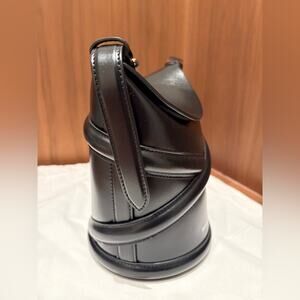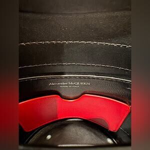 The Alexander McQueen The Curve Bag is inspired by the harness silhouette and crafted in sleek black calf leather. Finished with a high-frequency debossed Seal Signature, this versatile piece can be styled crossbody with the adjustable leather strap or over the shoulder with the strap looped back. Compact yet functional, it’s a bold accessory designed with signature McQueen edge.