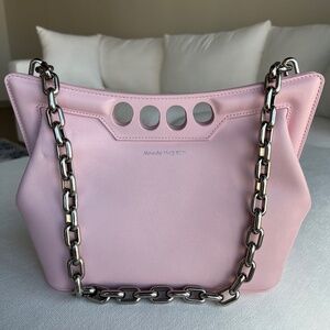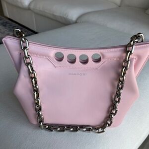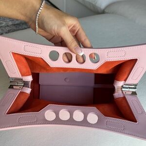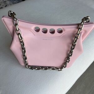 Inspired by the sharp and structured shoulders of the tailoring silhouettes, this small Peak bag is handcrafted from light pink calfskin leather with a curve-shaped magnetic frame, juxtaposed with a soft body. The bag can be worn over the shoulder using its antique silver-finished chain strap or hand-held by the four-ring handle. Originally $3,200.
