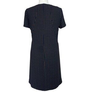 Alexander McQueen women's size IT 44 dress, it has a solid navy blue with color-block black and orange cross print, lightweight flowy material, short sleeves, crew neckline, lined, back hidden zip closure, above-the-knee length and shift style. Materials shell/lining 100% polyester. Care dry clean recommended. Condition is new with tags, interior material tag is loose as shown in pictures. MRSR $695.00 Please preview the measurements to ensure fit, typically runs small.