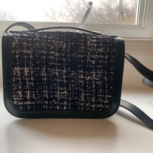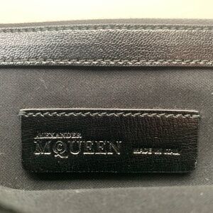 Alexander McQueen Tweed with black leather trim handbag with shoulder strap. Multi color tweed is black/white/gray/purple tones. Adjustable shoulder strap is 44 1/2" to 55 1/2" Bag measures 9 1/2" wide x 7" high x 3" deep. Large double zippered pockets on each side under flap. Silver tone hardware. Can use as couch with strap across the top. Like new condition.