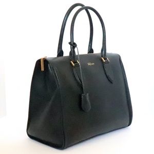 Hard to find item Alexander McQueen black leather 'Heroine' tote with top zipper closure and rolled leather handles Bag is made from black pebble calfskin leather, with tan fabric lining Features a hanging clochette and 5 gold-tone studs to protect the bottom Top zipper opens to tan fabric partitioned interior with 1 zippered and 2 slip pockets, divided by a central storage compartment Roomy interior can safely store your laptop or tablet, phone, wallet, sunglasses and more Bag dimensions: 14"L x 11"H x 7.5"D (with 6" handle drop) Good to very good condition (interior is clean; scuffs and scratches on exterior sides of bag--see last 4 photos) If you're just browsing 😊 many thanks, I appreciate your interest If you're truly interested in purchasing 😍 I suggest and will gladly consider all reasonable offers👍