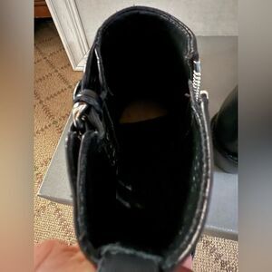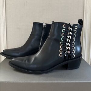 Alexander McQUeen black leather cowboy booties with silver hardware. 38.5 Inside zipper. Silver Chain and stud details on outer side. 1.5" heel. Worn once. Excellent condition with no stains, scuffs, rips or tears. $1350 was the outlet price.